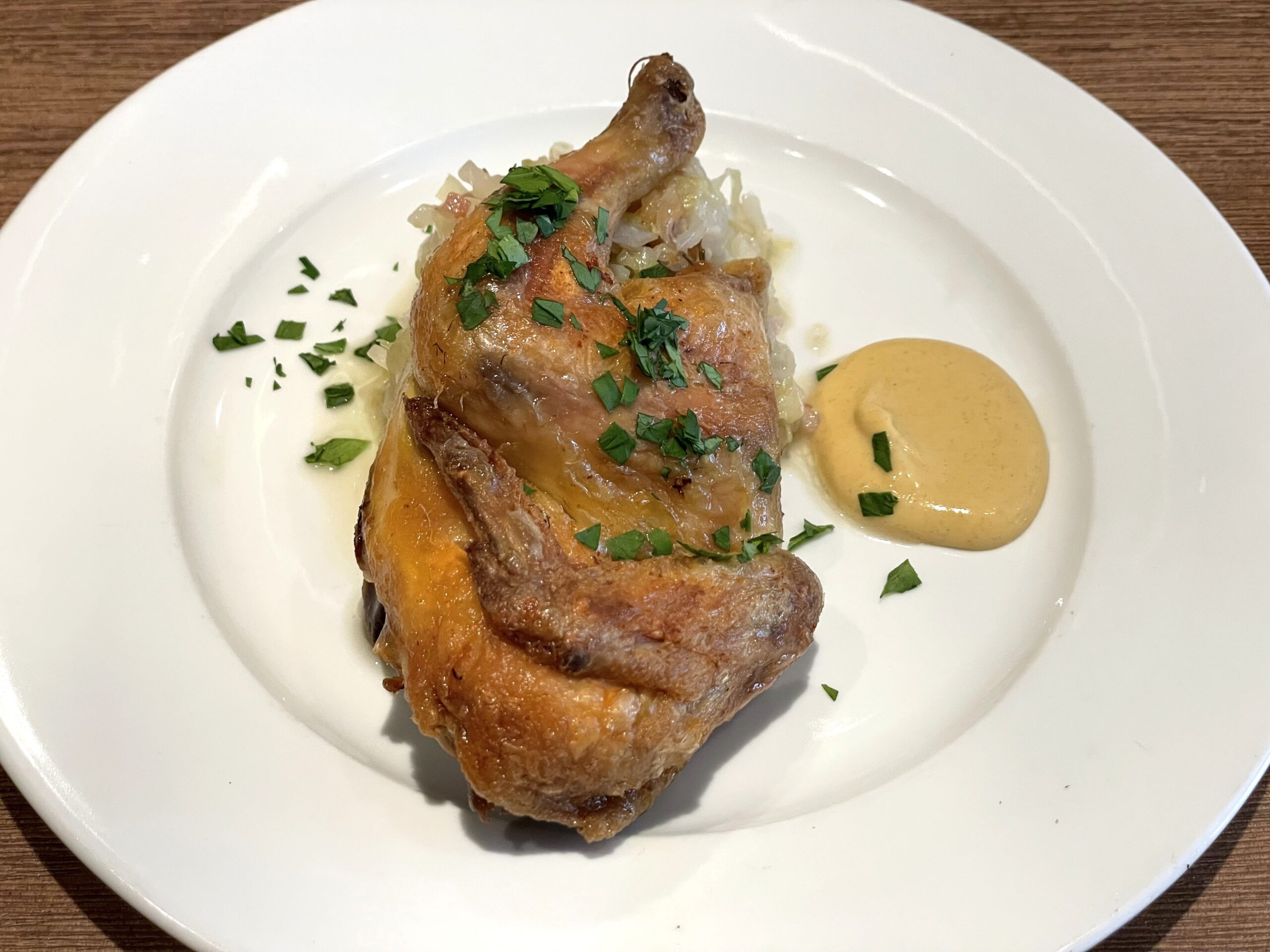 【本日の肉料理①】スペイン産若鶏のコンフィとシュークルート。