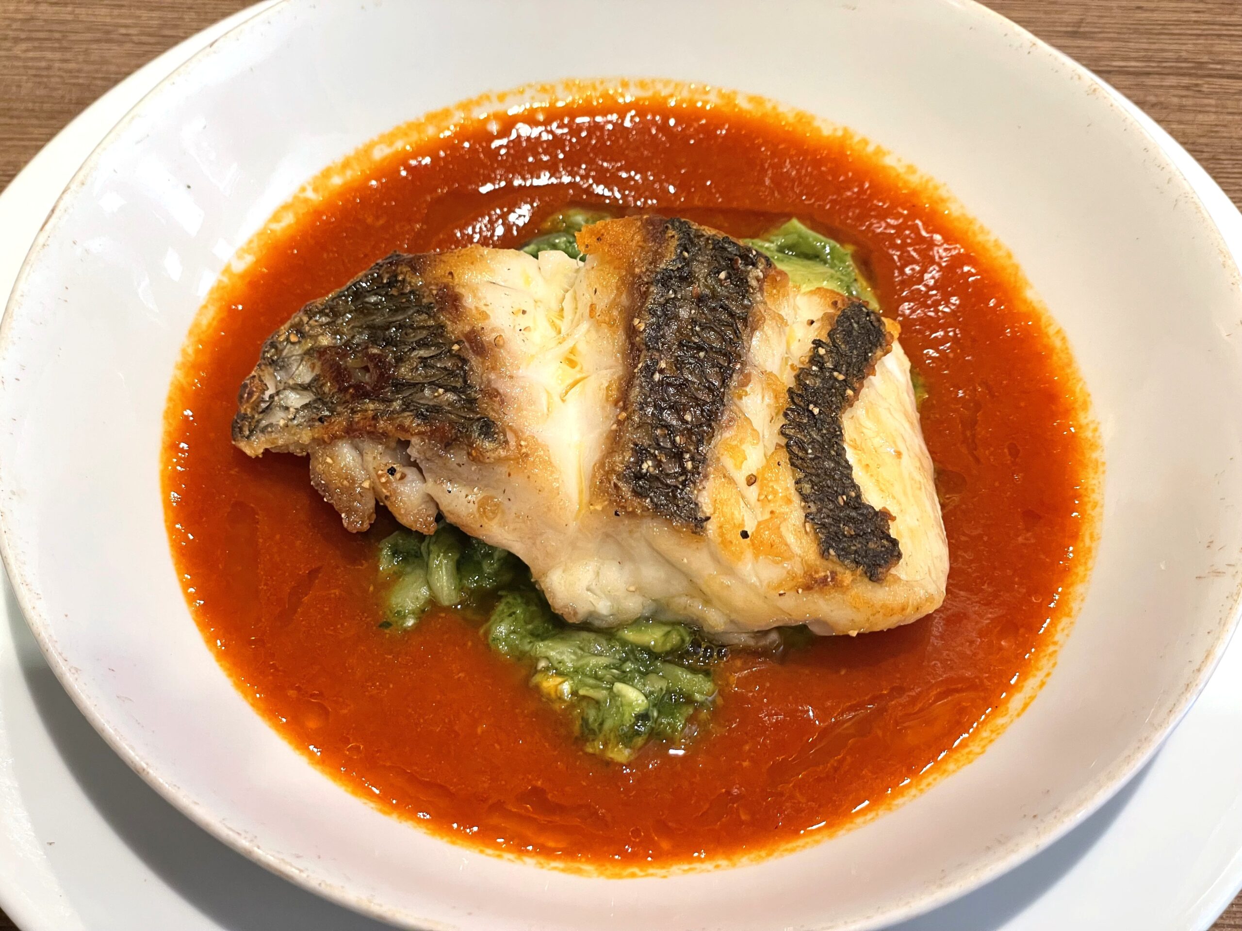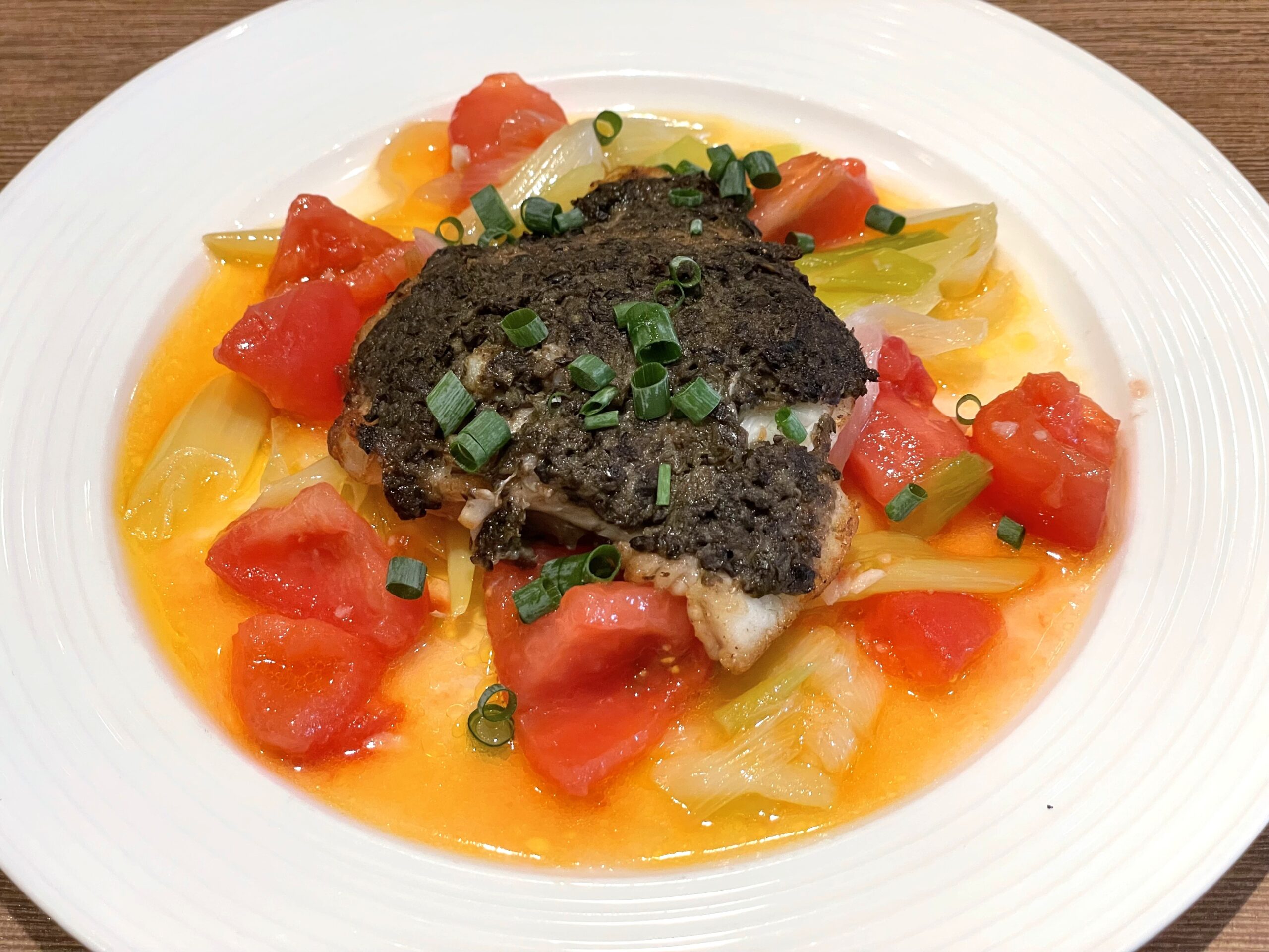 【本日の魚料理②】マトウダイのタプナード焼き 長ねぎのプレゼとフレッシュトマト。