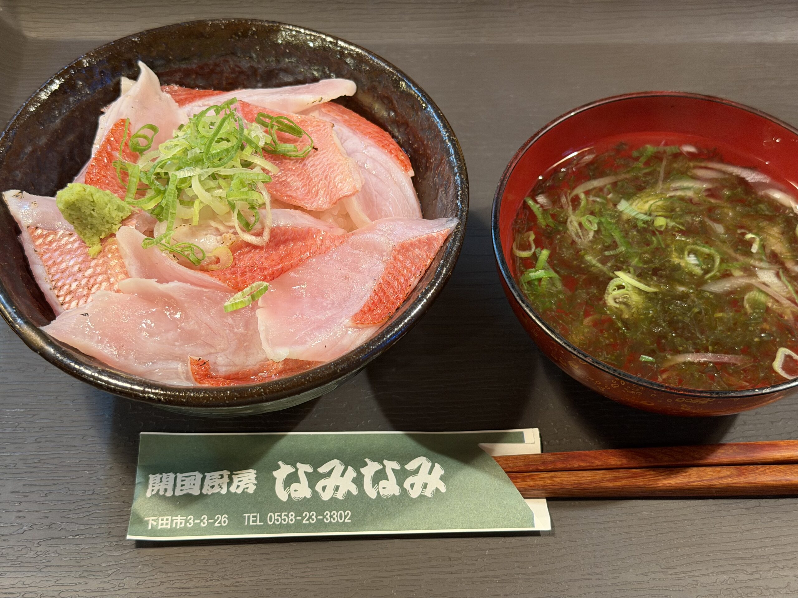 【下田地金目炙り丼】地金目とは、その日のうちに港に戻る金目鯛で、高い鮮度と脂の乗りを誇り、上品な甘味が特徴。