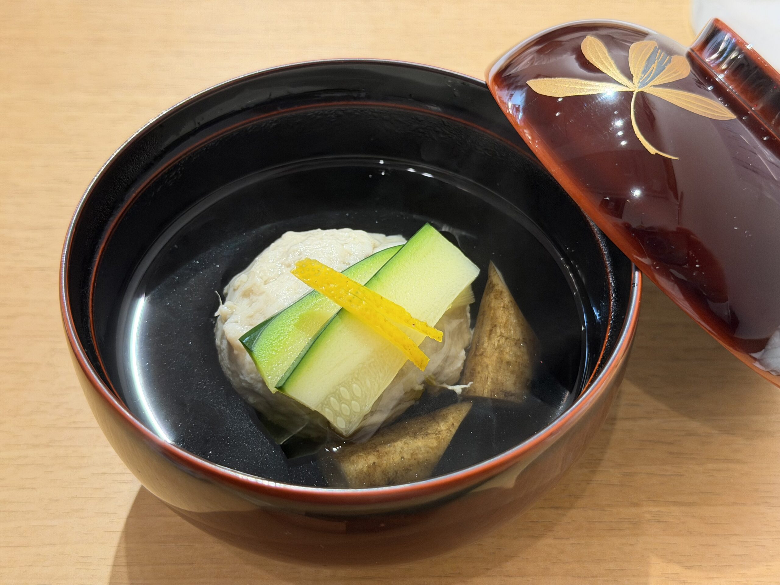 【お椀】メギスつみれのお椀。メギスとは、石川県・新潟県・愛知県の深い海に生息し、鮮度が落ちるのが早いため広く出回らない珍しい魚の一つです。