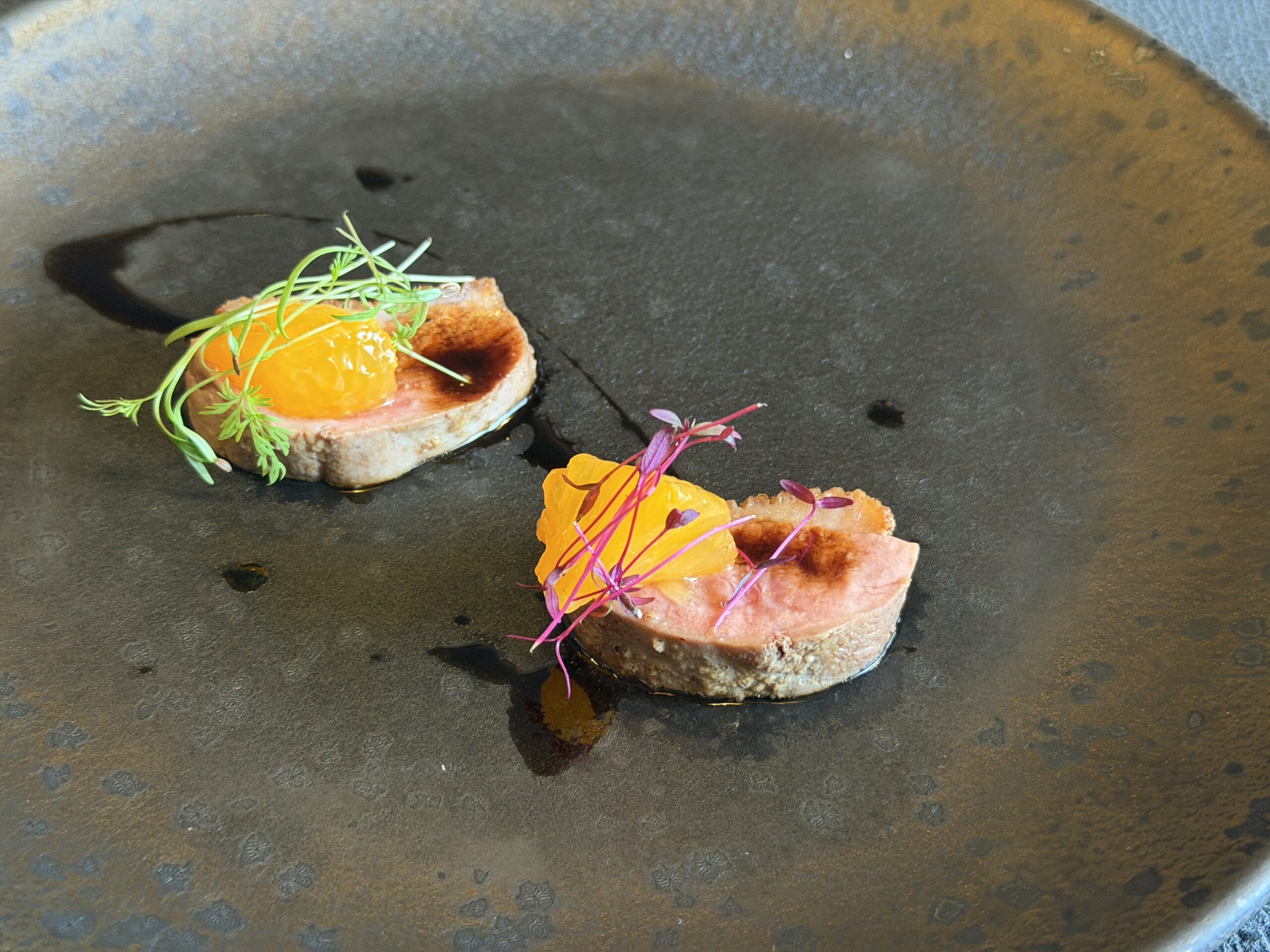 【前菜③】鴨胸肉と温州蜜柑 ジュニパーベリーとバルサミコのソース。