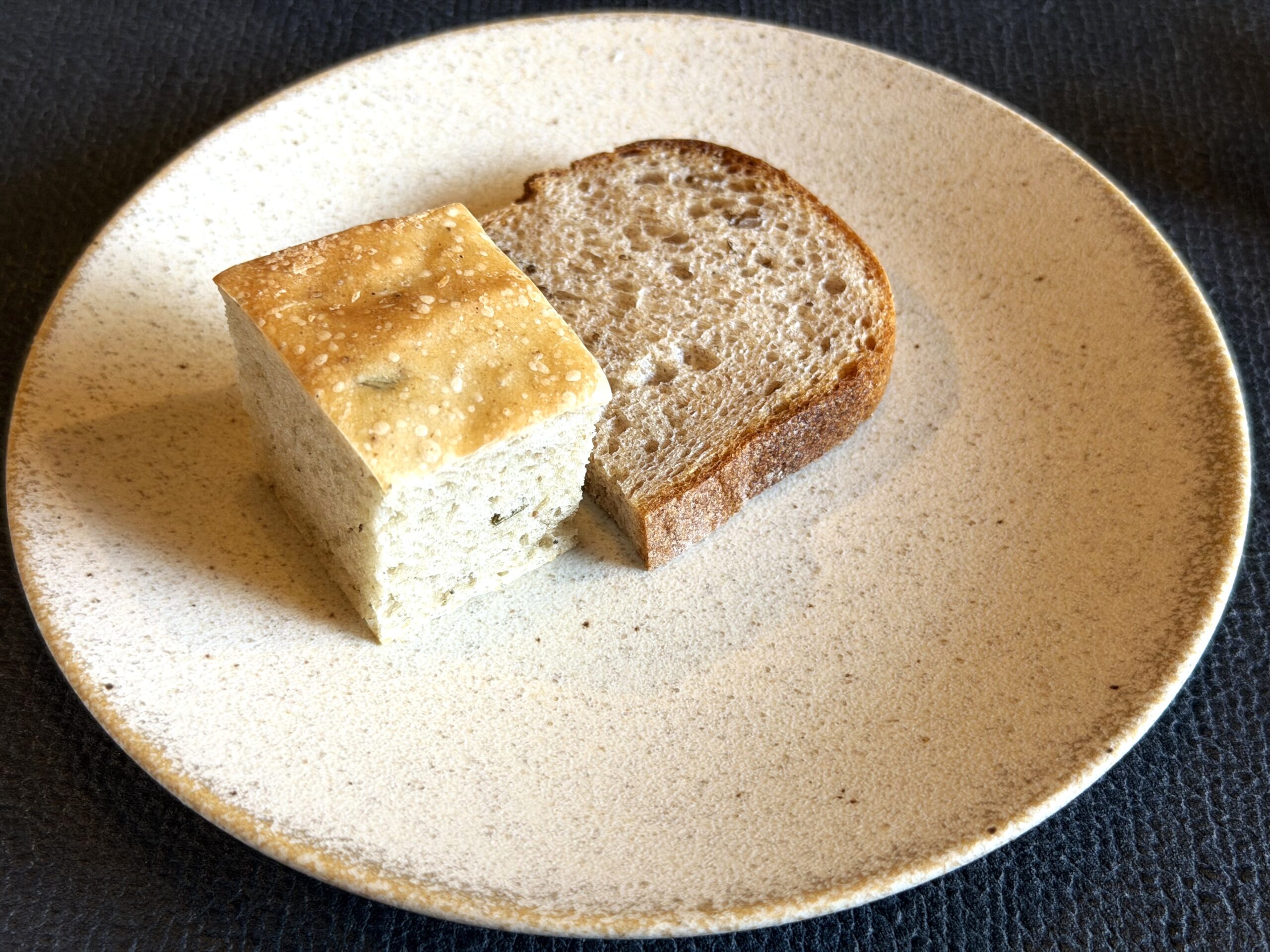 【自家製パン】白のパンはローズマリー、褐色のパンはガラムマサラが練り込まれています。