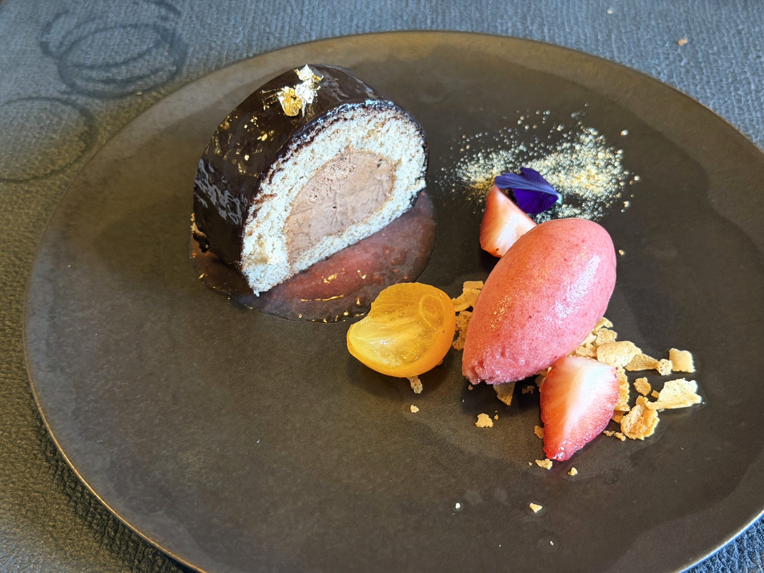 【デザート】クローブの香りを包み込んだ贅沢ショコラのロール仕立て フレーズのソルベ。