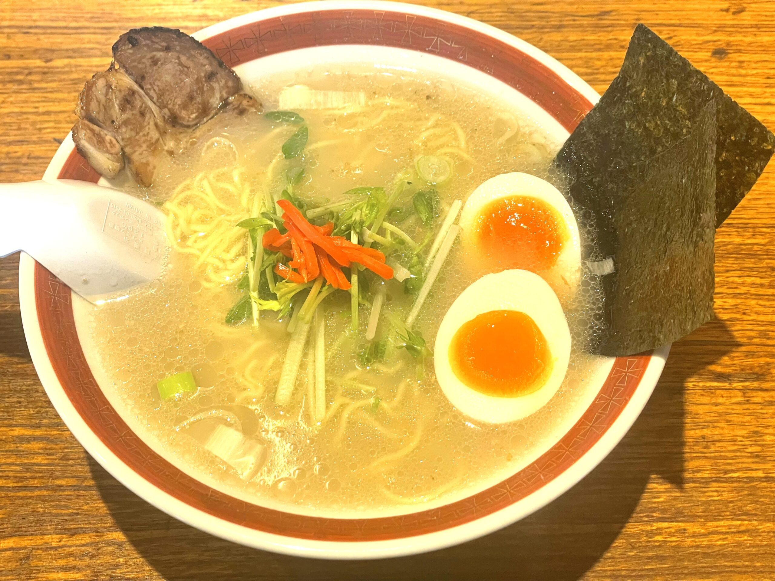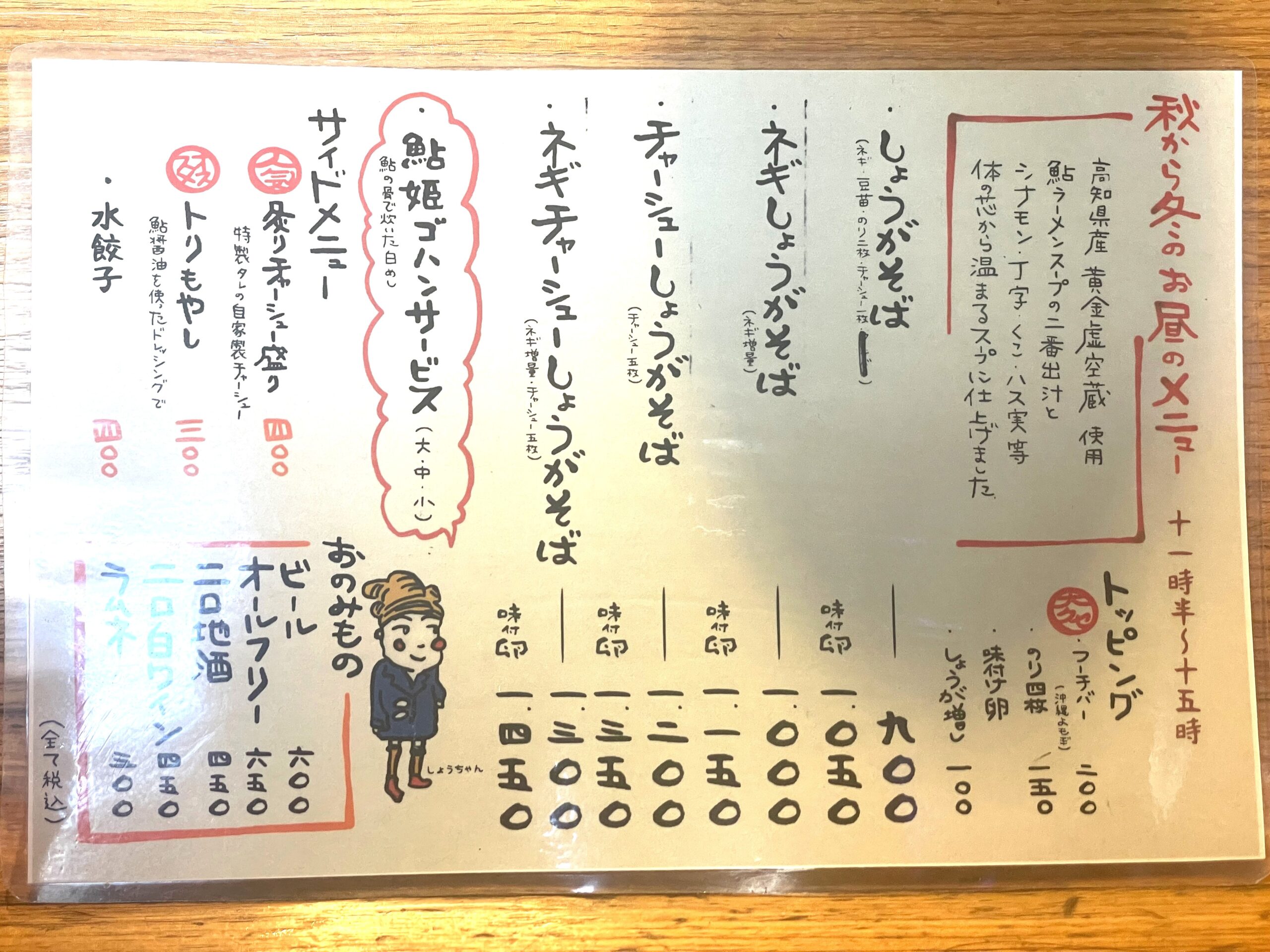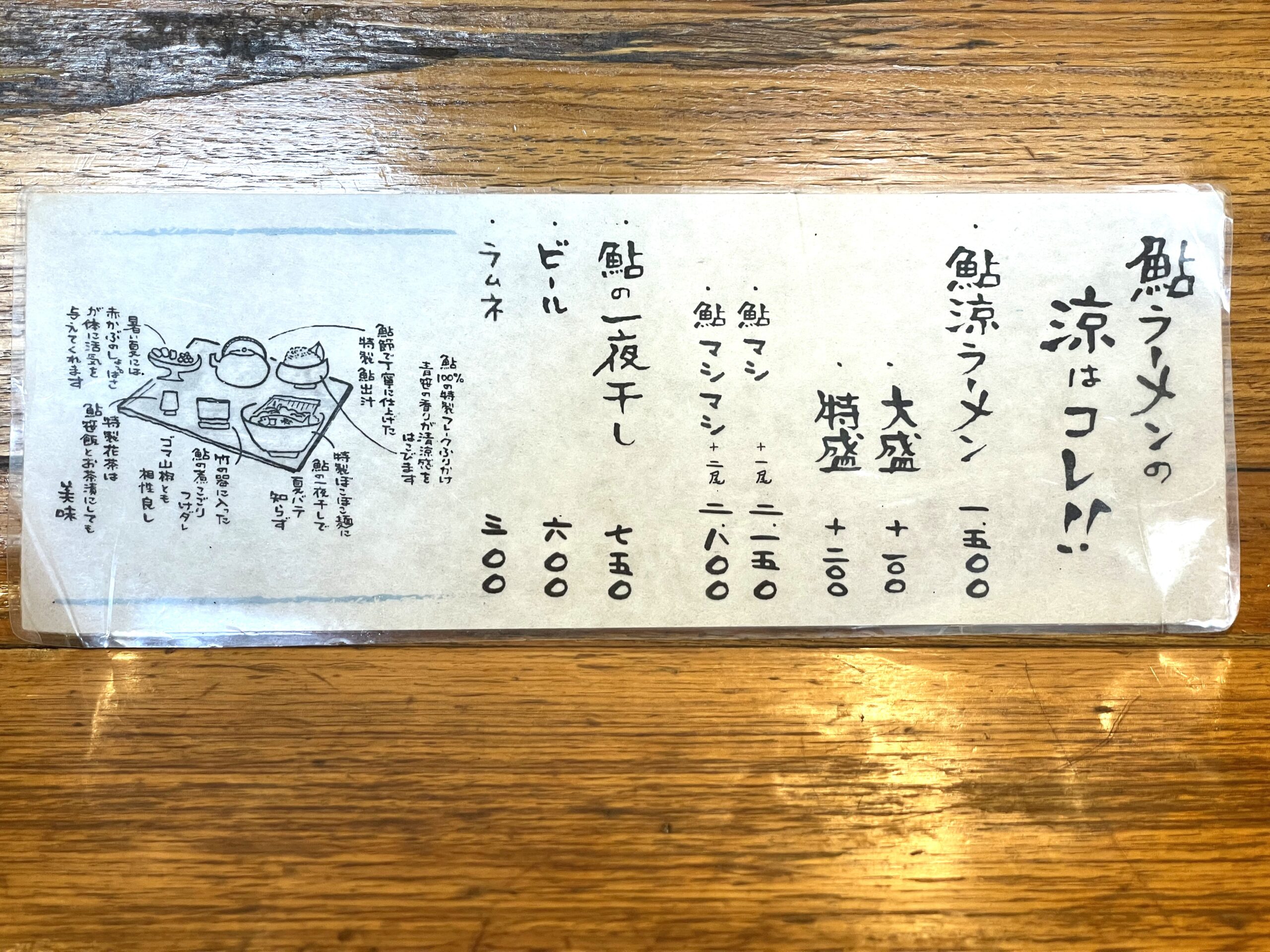 「鮎ラーメン」は、文字通り鮎を出汁とするラーメンです。岐阜県の馬瀬川や宮川で獲れた鮎を店内で調理しています。岐阜県高山市から直送されたちぢれ麺がスープとよく絡みます。昼は季節メニューで、鮎涼ラーメンが用意されています。10月から5月上旬までは端境期となるのでしょうがそばが提供されます。鮎涼ラーメンは、他に類を見ない鮎好きには堪らない一品です。しょうがそばは、長岡の生姜ラーメンよりもさっぱりしています。次回は夜のメニューを味わう予定です。
