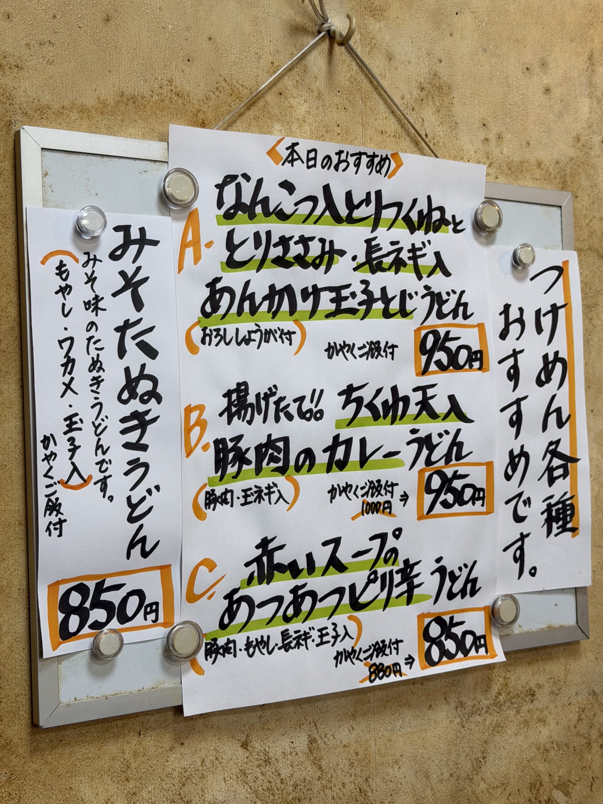 【本日のおすすめ①】みぞたぬきうどん。関西風の薄口醤油のつゆに味噌を加えたもの。
