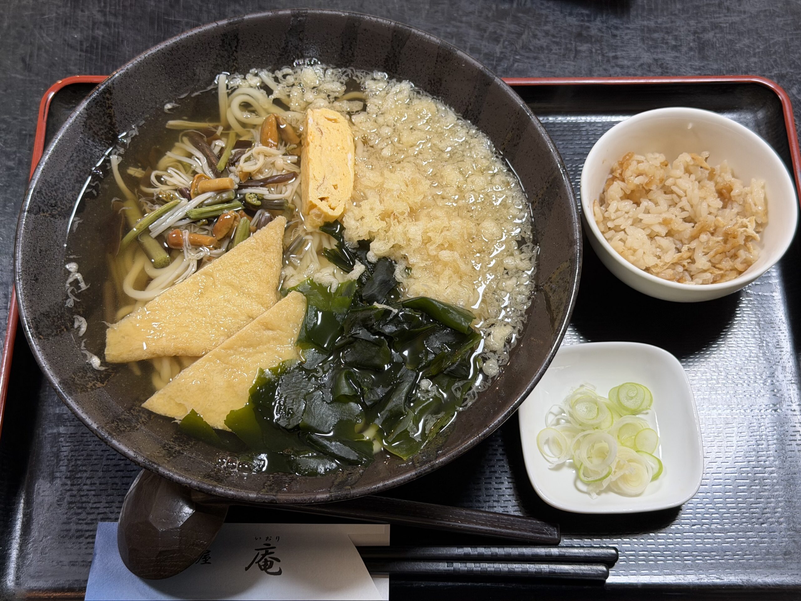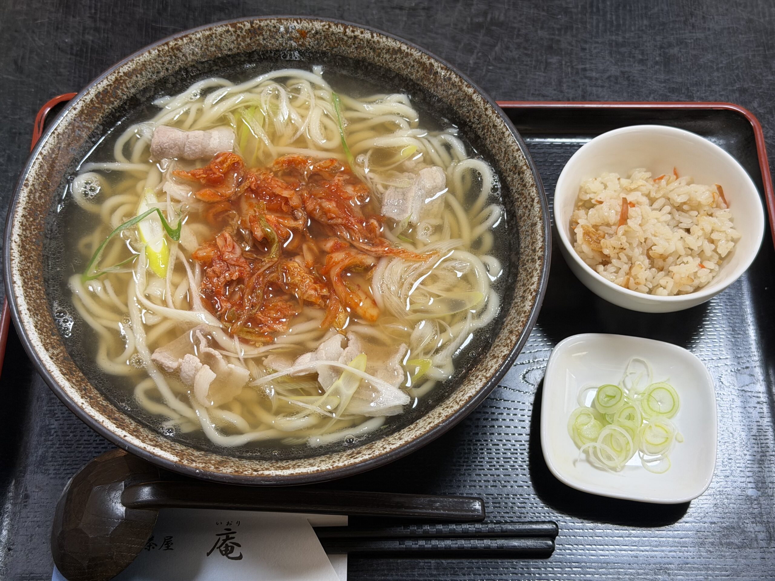 サラリーマンは、短い昼休みを有効に過ごすためそば屋とうどん屋で行列を作ります。横浜戸部は、料理飲食店が減ったことにより11時半から13時まではそば屋とうどん屋は長蛇の列。どちらもお財布に優しい料金設定で、セットメニューも充実しています。また、うどん2玉までは追加料金なしでサラリーマンを応援してくれます。ところで、「うどん茶屋庵(いおり)」は、文字通り行列が絶えない人気店であるがゆえに、敬遠してきました。13時を回ったある時に暖簾をくぐるとテーブル席に通されました。食欲をそそるお品書きと13時以降での着席率の高さと女将さんのおもてなしから、それ以降「うどん茶屋庵(いおり)」に通うようになりました。